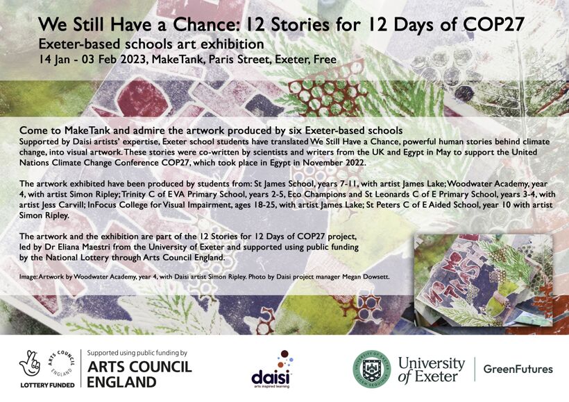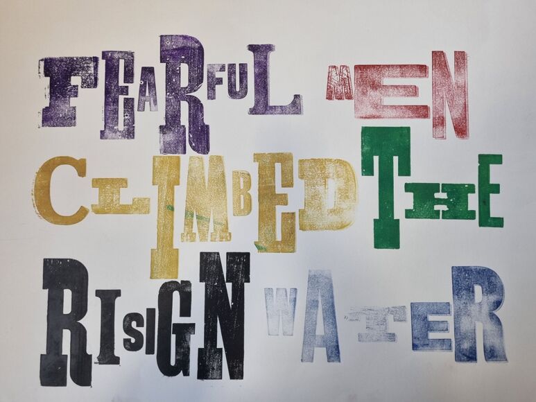 In December all our year 10 Fine Artists had the opportunity to work with Simon Ripley a printmaker, in collaboration with Daisi, on a two hour Letterpress workshop. They were responding to Aish Baladi, a story in which a catastrophic flood and mudslide have life-changing consequences for a remote Egyptian community. This was part of a collection of 12 Climate Stories for the 12 Days of the COP 27 Summit. The stories were uniquely co-created by scientists, health professionals, activists, and artists in the UK and Egypt, symbolising the ‘passing of the torch’ between the two most recent hosts of the global climate conference. Human health is intrinsically linked with the health of the planet, and this is a clear theme in these stories. For many of our students it was the first time using a piece of writing as the starting source for their artwork.